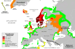 Hacksilver was common among the Norsemen or Vikings, as a result of both their raiding and trade. Hacksilver may also have been used by Romans in their dealings with Pictish tribes.[1] The name of the ruble, the basic unit of modern Russian currency, is derived from the Russian verb рубить ('rubit'), meaning "to chop", from the practice of the Rus', described by Ahmad ibn Fadlan visiting the Volga Vikings in 922. An example of the related Viking weighing scale with weights was found on the Isle of Gigha.[2] Hacksilver may be derived from silver tableware, Roman or Byzantine, church plate and silver objects such as reliquaries or book-covers, and jewellery from a range of areas. Hoards may typically include a mixture of hacksilver, coins, ingots and complete small pieces of jewellery.