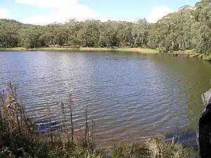 During 1853, American gold miners dug, an approximately 23 km, water race from Callaghans Swamp to underneath the Hanging Rock cliff face. Also that year Californians dug another water race from the swamp at the head of Dangars Gully to Nuggety Gully. In 1882, it took about twelve months to cut a 13 km water race from the Barnard River on the eastern side of the rough mountainous Great Dividing Range to the western side of the Range. Just south of Hanging Rock village are the Sheba Dams (with a surface area of 3.6 ha) which were erected by hand over a three-week period in 1888 to serve the sluicing needs of the miners. This construction was carried out by the Mt Sheba Company which leased the water rights for the area. Other water races were also constructed to feed various other mines around Bowling Alley Point and Hanging Rock.[2]