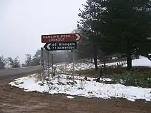 Hanging Rock is a gold mining village and also rock face on the Northern Tablelands, New South Wales, Australia. This former gold mining town is situated about 10 km south east of Nundle. The village is part of the Tamworth Regional Council district and Parry County. Hanging Rock's geographical coordinates are 31° 29′ 0″ South, 151° 12′ 0″ East and the elevation is about 1100 m. Due to the high altitude of the village, Hanging Rock and the surrounding mountains can occasionally receive a snow fall on the coldest of winter days. At the 2021 census, Hanging Rock had a population of 98.[1]