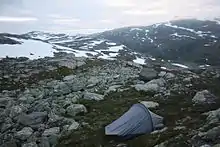 The landscape of the Hardangervidda is characterised by barren, treeless moorland interrupted by numerous pools, lakes, rivers and streams. There are significant differences between the west side, which is dominated by rocky terrain and expanses of bare rock, and the east side, which is much flatter and more heavily vegetated. The climate also varies between the two sides: it is considerably wetter on the west side than on the east, with over 1,000 millimetres (39 in) per year recorded in some parts.[4] The prominent peak of Hårteigen 1,690 m (5,545 ft) is visible across much of the plateau.[5][6]