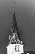 Havstein cemetery was consecrated on 14 August 1854 to serve the western part of the city. Soon after, a church was built beside the cemetery. The church was consecrated on 30 November 1857. The church was originally built as an annex for Strinda Church, the main church for the parish. The neo-Gothic, stone church was built in a long church style and designed by the architects Heinrich Ernst Schirmer and Wilhelm von Hanno. The altarpiece was designed in 1863 by sculptor Ole Laulo (1825-1901).[4] In 1900, the original tower on the roof of the nave was removed and a new wooden tower was built on the west side of the building. The tower was designed by architect Erik Selnes. In 1926, a baptismal sacristy was built on the south side and the whole church got a new roof. The stained glass in the church is from 1968 and was made by artist Carsten Lien (1894-1970)[5].[6]