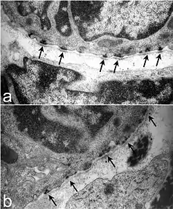 ![]() Ultrastructure of tracheal hemidesmosomes in mice. In a normal mouse (a) there are well-defined, organized hemidesmosomes with darkened areas in the lamina densa abutting the hemidesmosome (arrows). In contrast, hemidesmosomes in Lamc2 -/- tracheas (b) are less organized, the intracellular component is more diffuse, and the lamina densa directly below the hemidesmosomal areas lacks the electron density seen in the littermate control (arrows). From Nguyen et al., 2006.[1] | |