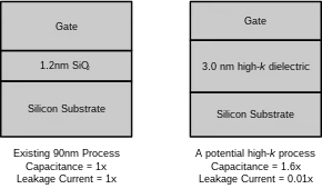 In early 2007, Intel announced the deployment of hafnium-based high-κ dielectrics in conjunction with a metallic gate for components built on 45 nanometer technologies, and has shipped it in the 2007 processor series codenamed Penryn.[7][8] At the same time, IBM announced plans to transition to high-κ materials, also hafnium-based, for some products in 2008. While not identified, the most likely dielectric used in such applications are some form of nitrided hafnium silicates (HfSiON). HfO2 and HfSiO are susceptible to crystallization during dopant activation annealing. NEC Electronics has also announced the use of a HfSiON dielectric in their 55 nm UltimateLowPower technology.[9] However, even HfSiON is susceptible to trap-related leakage currents, which tend to increase with stress over device lifetime. This leakage effect becomes more severe as hafnium concentration increases. There is no guarantee, however, that hafnium will serve as a de facto basis for future high-κ dielectrics. The 2006 ITRS roadmap predicted the implementation of high-κ materials to be commonplace in the industry by 2010.