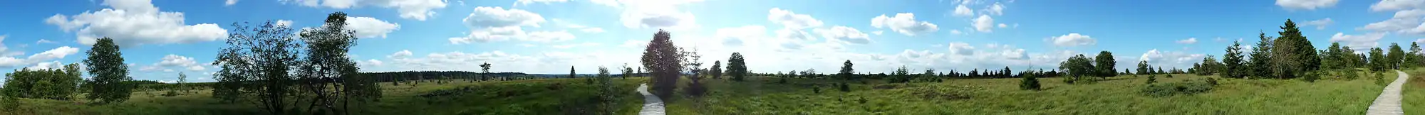 The High Fens (German: Hohes Venn; French: Hautes Fagnes; Dutch: Hoge Venen), which were declared a nature reserve in 1957, are an upland area, a plateau region in Liège Province, in the east of Belgium and adjoining parts of Germany, between the Ardennes and the Eifel highlands. The High Fens are the largest nature reserve or park in Belgium, with an area of 4,501.2 ha (11,123 acres; 45.012 km2); it lies within the German-Belgian natural park Hohes Venn-Eifel (700 km2 (270 sq mi)), in the Ardennes. Its highest point, at 694 metres (2,277 ft) above sea level, is the Signal de Botrange near Eupen, and also the highest point in Belgium. A tower 6 metres (20 ft) high was built here that reaches 700 metres (2,297 ft) above sea level.[2][3] The reserve is a rich ecological endowment of Belgium covered with alpine sphagnum raised bogs (not "fens" as the name would imply) both on the plateau and in the valley basin; the bogs, which are over 10,000 years old, with their unique subalpine flora, fauna and microclimate, are key to the conservation work of the park.[4][5]