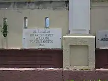 Plaque on outside wall of Nuestra Señora de la Candelaria church in Manatí, Puerto Rico, where it says mayor Hilarión Guerra called the plaza where this church is located- "blessed"