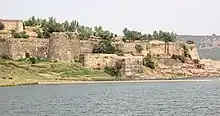 Gagron Fort is a hill fort situated in Jhalawar district. It is an example of a hill and water fort.[37][38] The fort was built by Bijaldev Singh Dod (a Rajput king) in the twelfth century. Later, the fort has also been controlled by Sher Shah and Akbar. The fort is constructed on the confluence of Ahu River and Kali Sindh River. The fort is surrounded by water on three sides and a moat on the forth side and hence earned the name "Jaladurg". The fort has reportedly seen 14 battles and 2 jauhars of queens.[39][40]