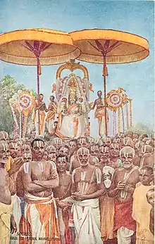 Perumal (Tamil: பெருமாள்), also rendered Thirumal, is a form of Vishnu worshipped in the Sri Vaishnava tradition. He is also venerated by the epithets of Narayana, Varadharaja, Rangaraja, Ranganatha, Kallalagar, Govindaraja, and several others in his temples scattered throughout the Tamil country. Originally venerated as the god of the forests, Perumal was assimilated with Vaishnavism, having earlier conceived been as either a pantheistic or a monotheistic divinity. Through the concept of bhakti, first introduced to the region by the Alvars, Vaishnavism became among the oldest faiths to influence the Tamil people.[70] The deity, and his consort Lakshmi, as well as her aspects of Sridevi, Bhudevi, and Niladevi, are primarily venerated, and are also represented as the Dashavatara in Perumal temples in Tamil Nadu. He is the deity who is primarily addressed in the Naalayira Divya Prabandham, a compilation of works by the Alvar saints, whose philosophy and hymns were propagated in the works of Ramanuja, Manavala Mamunigal, and Vedanta Desikan.[71] The largest Hindu temple in India is dedicated to Perumal in his form of Ranganathaswamy, situated at Srirangam.[72] The Alvars influenced the establishment of the Divya Desams, 108 shrines of Perumal that were glorified in their works, which continue to be visited as major shrines of pilgrimage by Tamil Vaishnavas.[73]