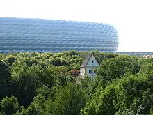 With the construction of the nearby Allianz Arena, an international competition for an artwork was initiated which was won by Timm Ulrichs. The focus was on the disappearance of the former village of Fröttmaning. Approximately 150 meters south of the Holy Cross Church, in 2006, an inaccessible replica of the Romanesque church was created in original size from painted precast concrete parts. The surreal-melancholic work of art "sunken village" at the foot of the Fröttmaning mountain of rubble is a kind of a loss display, the disappearing in this place. The copy was arranged in such a way that the building seems half buried from the mountain.