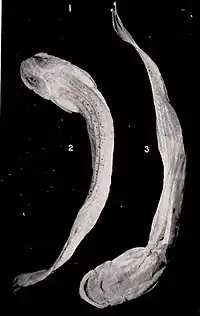 Homodiaetus is currently distinguished from other genera of Stegophilinae by the combination of the origin of the pelvic fin midlength between the tip of the snout and the caudal-fin origin, the opercle with three or more odontodes, and the gill membranes confluent with the isthmus.[2] Homodiaetus species are small and grow up to 42 millimetres (1.7 in) SL. They are transparent with the except of the head and abdomen.[2] Homodiaetus species have a thin body and depressed head that is almost as wide as the head is long. The dorsal and ventral profiles are straight except for a convex head. The mouth is inferior.[2]
