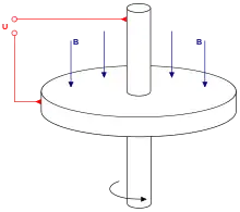 A homopolar generator is a DC electrical generator comprising an electrically conductive disc or cylinder rotating in a plane perpendicular to a uniform static magnetic field. A potential difference is created between the center of the disc and the rim (or ends of the cylinder) with an electrical polarity that depends on the direction of rotation and the orientation of the field. It is also known as a unipolar generator, acyclic generator, disk dynamo, or Faraday disc. The voltage is typically low, on the order of a few volts in the case of small demonstration models, but large research generators can produce hundreds of volts, and some systems have multiple generators in series to produce an even larger voltage.[1] They are unusual in that they can source tremendous electric current, some more than a million amperes, because the homopolar generator can be made to have very low internal resistance. Also, the homopolar generator is unique in that no other rotary electric machine can produce DC without using rectifiers or commutators.[2]