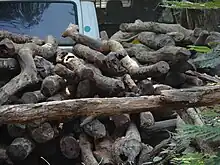 Pterocarpus santalinus was listed as an Endangered species by the IUCN, because of overexploitation for its timber in South India; however, it was later reclassified to Near Threatened in 2018, as the scale of this loss is not properly known.[11] It is also listed in the appendix II of the CITES, which means that a certificate is required in order to export it, that should only be granted if the trade is not detrimental to the survival of the species.[12]