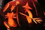 At the modern Hop-tu-Naa, children dress up and go from house to house hoping to be given sweets or money, as elsewhere. The children carry carved "turnip" lanterns (which are known as "moots" by the Manx) and sing Hop-tu-Naa songs. There are regional varieties of how turnips should be carved for Hop-tu-Naa, with variations focusing on which way up the turnip is and the nature of the decorations.[2] It is believed that turnip-lanterns do not date earlier than the start of the 19th century, as the vegetable had only been introduced at the end of the previous century.[4] In the past children would bring the stumps of turnips with them and batter the doors of those who refused to give them any money, in an ancient form of trick or treat. This practice appears to have died out.[5]