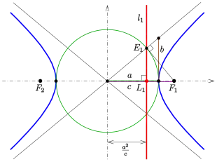 is called the circular directrix (related to focus ) of the hyperbola.[8][9] In order to get the left branch of the hyperbola, one has to use the circular directrix related to . This property should not be confused with the definition of a hyperbola with help of a directrix (line) below.