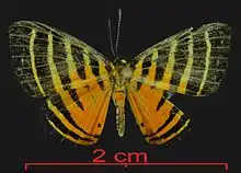 The wingspan is about 25 mm. There is sexual dimorphism. Males have an orange base colour, while the base colour for females is white.