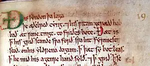 The text itself refers to the promulgations as lagu, "law", one of the earliest authentic Old English borrowings of the Norse word lǫg.[26] It contains a number of other Scandinavian words, such as lahcop ("law purchase"), landcop ("[tax on] land purchase"), and witword ("wise word", possibly meaning "witness" or "agreement", or else denoting a plausible claim to a property),[27][28] indicating respect for pre-existing legal custom in "Danish" England.[29][30][31] Neff noted that "the fines and payments are in all cases stated in Scandinavian terms", including "hundreds (of silver ores), ores and marks".[5]