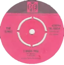 "I Need You" is a song by British rock band the Kinks. It was released as a B-Side to "Set Me Free". The song, along with "You Really Got Me" and "All Day and All of the Night", has been cited as one of the influences which shifted the focus from rock 'n' roll to hard-hitting rock music. Never a part of the Kinks live act, it has since been revived live by both Davies brothers solo in the 21st Century.[2]