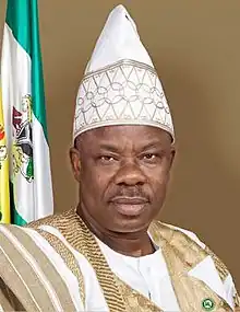 Ibikunle Amosun ( ⓘ; born 25 January 1958) is a Nigerian politician,[2] former governor of Ogun State and two-term senator of the Federal Republic of Nigeria. He first served as an elected senator for Ogun Central district of Ogun State, Nigeria from June 2003 to June 2007, and reelected in 2019. After an unsuccessful bid for governor of Ogun State in April 2007, he was elected governor of the state on the Action Congress of Nigeria (ACN) platform in 2011.[3][4] He contested again for a second term as governor under the All Progressives Congress and after winning the election, was sworn into office on 29 May 2015.[5]