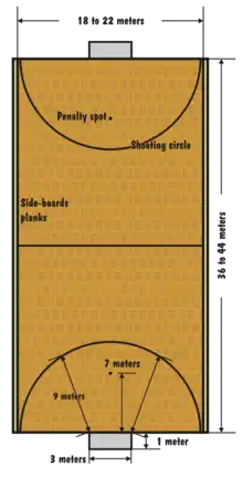• The pitch is smaller than the outdoor pitch. An indoor pitch is 18m to 22m wide by 36m to 44m long (similar to a handball or futsal pitch), divided by a center line. The shooting circle is a semicircle measured out 9m from each goal post. Side-boards mark the sidelines, helping to keep the ball on the pitch and allowing players to play against it. When the ball goes over the endline, the defensive team will restart play regardless of which team played the ball last. The pitch is made of wood or synthetic material. The board surface facing the playing surface is angled slightly to encourage ball to bounce down not up.