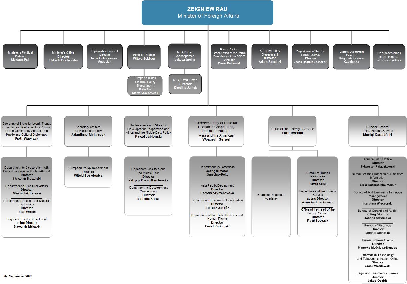 - ↑ "Organisional scheme of the MFA". Ministry of Foreign Affairs Republic of Poland. 2023-09-04. Retrieved 2023-09-05.