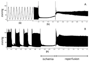Kidney ischemia is a loss of blood flow to the kidney cells. Several physical symptoms include shrinkage of one or both kidneys,[18] renovascular hypertension,[19] acute renal failure,[18] progressive azotemia,[18] and acute pulmonary edema.[18] It is a disease with high mortality rate and high morbidity.[20] Failure to treat could cause chronic kidney disease[21] and a need for renal surgery.[22]