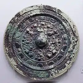 The Izumi Koganezuka Kofun is a zenpō-kōen-fun (前方後円墳), which is shaped like a keyhole, having one square end and one circular end, when viewed from above. It is located at the northwestern end of Shintayama hill, surrounded paddy fields, but the location is also close to the ancient provincial capital of former Izumi Province. The tumulus has a total length of about 94 meters. The presence of a kofun at this location has been known since antiquity, but in November 1945, a 17-year-old student noticed that the tumulus was severely damaged and convinced local authorities that a rescue archaeology excavation be performed. At that time, a leather-lacquered shield with copper decorations, iron swords and other metal artifacts were discovered. In 1950 to 1951, further excavation of the posterior circular portion by the Osaka Prefectural Board of Education and the Japanese Archaeological Association found the burial chamber within which three clay-covered wooden caskets were found side by side. The central casket had the remains of a woman, and she was flanked on either side with the remains of two men. Within and surrounding these coffins were a large quantity of grave goods, including Shinju-kyo mirrors, magatama beads and other jewelry, fragments of armor and a helm, iron swords, spears and other weapons, and other artifacts. The inscription of one of the mirror gave the reign date of Keisho 3, which corresponds to 238 AD. This drew great attention by historians, as per the Chinese chronicle Wei zhi (魏志 "Records of Wei"), which is part of the Records of the Three Kingdoms (三國志), in the year 239 AD Emperor Cao Rui sent "one hundred bronze mirrors" to Queen Himiko of Wa,[3] and it was possible that this was one of these mirrors. These excavated items are now are in the possession of the Tokyo National Museum.[4]