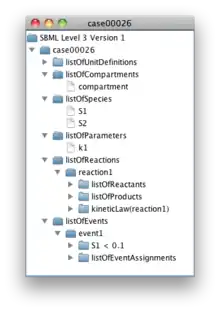 The following coding example shows how an SBML file can be parsed and its content can be displayed in form of a tree in a window. The result can look, e.g., as the image on the right. It can be seen that the actual parsing of SBML is done in a single line, by calling a static method in the class SBMLReader. The creation of the tree for the display is also trivial, because the entire data structure in JSBML is organized as a tree. import javax.swing.*;