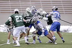 The Jacksonville Dolphins men's lacrosse team is a college lacrosse team that represents Jacksonville University in Jacksonville, Florida, United States. As of the upcoming 2023 season, the Dolphins compete in JU's full-time home of the ASUN Conference. The men's lacrosse team had been an associate member of the Southern Conference (SoCon) in the 2022 season under the terms of an agreement between the ASUN and SoCon made when the ASUN relaunched its men's lacrosse league in that season.[2] However, a conference realignment triggered by the Atlantic 10 Conference's announcement that it would sponsor men's lacrosse starting in the 2023 season led to the SoCon dropping the sport. Following the 2022 season, Jacksonville returned men's lacrosse to the ASUN.[3]