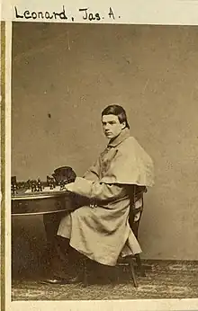 James A. Leonard (November 6, 1841 Ireland – September 26, 1862 Annapolis, Maryland) was a young American chess master, who grew up as a son of poor Irish immigrants in New York City. He learned to play chess at age 16 or 17. Before his 20th birthday, he was already famous for his fierce attacking play and prowess at blindfold chess, at which he played as many as ten games simultaneously.
