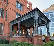 The mansion is a red brick building with the main entrance on Massachusetts Avenue. The original design included an entrance for carriages on Massachusetts Avenue with a large stained glass window above and a separate stone entrance with brass railings facing Dupont Circle. A fireplace stood at the end of a large wood-finished hallway measuring 15 feet (4.6 m) wide and 45 feet (14 m) long as one entered the Dupont Circle entrance. Off this main hallway was the reception room on the right and parlors, the dining room, and library on the left. The dining room was not large compared to the size of the house and included a dumbwaiter. There were many elaborately decorated rooms in the house including a bathroom featuring a Turkish bath and a billiards room in the basement.[11][56] Every room in the house had a fireplace, many of which were accented with mantelpieces and mirrors. There were 64 windows allowing natural light throughout the building and an oak stairwell decorated with elaborate carvings.[11]