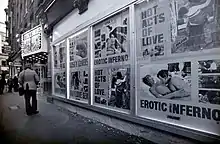 - ↑ Any sex shop opened in London by any pornographer had to pay an opening bribe of between £500 to several thousand and a weekly bribe to the OPB, depending on the takings of the outlet. Some outlets, like one sex shop on Wardour Street, cost £150 a day in bribes. The payments ensured that the shops could operate without undue interference and that no-one else was able to open other sex shops in the vicinity.[37] The bribes were affordable because of the profit margins on pornography and the size of the market, which was estimated at £10 million a year in the UK in 1971. While the front room of the sex shops sold legal softcore pornography, the back room would sell the illegal hardcore version.[11][29] While the softcore material sold with a high profit margin, this paled when compared with hardcore output.[38] Explicit magazines sold in Denmark or Amsterdam for 50p to 60p each would retail for £5 in London; 200-foot (61 m) black and white films (known in the trade as rollers) were purchased in Denmark for £3 and sold for £15, while colour films cost £5 to £9 and retailed at £30. The 400-foot (120 m) colour rollers were sold for as much as a purchaser was willing to pay.[35][39]