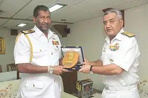 He has held, in order, the SLN's Southern and Western Commands in the 2007-2009 period, and following a brief three-month stint as the navy's Director General- Services, was appointed Director General- Operations- a position he occupied until July 2013, when he was appointed Chief of Staff of the SLN.[3][4][5] He was awarded the Rana Wickrama Padakkama the same year[6]