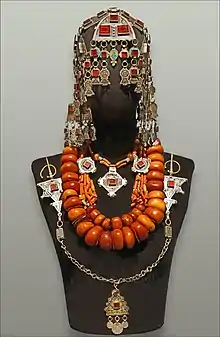 Pieces of jewellery were valued objects and worn for important celebrations, such as weddings, religious and social gatherings like country fairs (moussem). They constituted the most important part of a husband's wedding gifts and a woman's dowry, that remained her personal property even in case of a divorce, and were passed on from one generation to the next.[40] Due to changes in generations, taste and wealth, they were often changed and reworked. Therefore, the age of many pieces is difficult to date, and one has to assume that most of them were only made in the late 19th and early 20th centuries.[12][41] Just as other elements of a person's appearance, jewellery was not only worn for aesthetic purposes, but also carried information about the social situation of women, including messages about marital status, wealth and social hierarchy.[42]