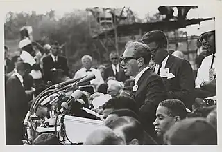 The American Jewish Congress (AJC), founded in 1918, played a significant role in civil rights advocacy during a critical period in American history. Committed to promoting social justice and equality, the AJC actively engaged in various civil rights initiatives.[38] Stanley Levinson, king's advisor also served in the Manhattan board of the AJC.[39] One of the prominent leaders within the organization was Rabbi Joachim Prinz, whose contributions left a lasting impact on the intersection of Jewish and civil rights activism. Rabbi Joachim Prinz, serving as the president of the AJC from 1958 to 1966, emerged as a key figure in the civil rights movement. His leadership emphasized the shared commitment to justice among diverse communities.[40] Rabbi Prinz notably participated in the historic March on Washington for Jobs and Freedom in 1963. His impassioned speech during the event, delivered just before Dr. Martin Luther King Jr.'s iconic "I Have a Dream" address, highlighted the interconnected actions against prejudice and discrimination. Rabbi Prinz's eloquent articulation of the moral imperative for civil rights underscored the AJC's dedication to the broader principles of equality and justice within the context of the larger civil rights movement.[41][38]