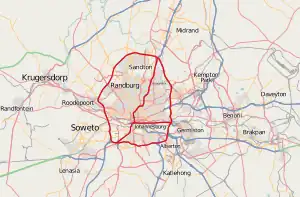 The Johannesburg Ring Road is a set of freeways that circle the city of Johannesburg, South Africa and service the City of Johannesburg Metropolitan Municipality.[1][2][3][4] The entire Ring Road is an e-toll highway (with open road tolling) and is approximately 83 km long.