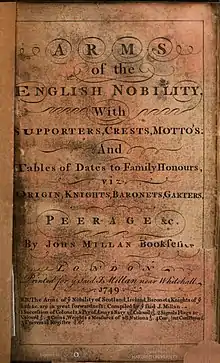 - Millan, John, Arms of the English Nobility: With Supporters, Crests, Motto's: and Tables of Dates to Family Honours, Viz. Origin, Knights, Baronets, Garters, Peerage &c., 1749