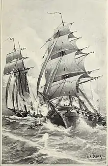 The schooner Victory was laden with "valuable cargo from Norfolk", and had been sailing under the French flag for five days when Shaw recaptured the ship for the United States. Two days later he recaptured the brig Androscoggin, which had been under French control for six days.[5] In spring 1800, Lieutenant Shaw sparred with an Imperial Spanish brig, captured two French privateers (Citoyenne and the schooner Seine), and a French Naval lugger carrying a divisional general of the French Army. On his own initiative, Shaw traded the French general for two American mariners held prisoner in Puerto Rico.[1] Mid-1800 saw Shaw's Enterprise capture: the French brig Flambeau; the French privateers l'Aigle, Cygne,[5] and Pauline (the latter carrying the French consul to Puerto Rico); the French letter-of-marque Guadaloupéenne with the same French divisional general as had been captured that spring;[1] and eleven further captured American ships.[6]