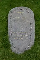 On 20 May 1994, following a public funeral service in Cluny Parish Church, Edinburgh, which was attended by almost 1,000 people,[37] Smith was buried in a private family service on the island of Iona, at the sacred burial ground of Reilig Odhráin, where many early Scottish and Norse kings are said to be buried.[38][39] His grave is marked with an epitaph quoting the Fourth Epistle of An Essay on Man by Alexander Pope: "An honest man's the noblest work of God".[40] His close friend Donald Dewar acted as one of Smith's pallbearers. On 14 July 1994, a memorial service for Smith took place at Westminster Abbey and was attended by over 2,000 people. The Archbishop of Canterbury, George Carey, gave an address.