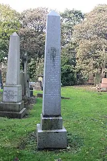 He died on 15 April 1910. He is buried on the edge of the path which runs over the central vaults in Warriston Cemetery.