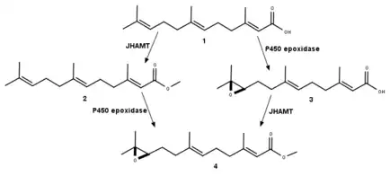 - ↑ Shinoda T, Itoyama K (October 2003). "Juvenile hormone acid methyltransferase: a key regulatory enzyme for insect metamorphosis". Proceedings of the National Academy of Sciences of the United States of America. 100 (21): 11986–91. Bibcode:2003PNAS..10011986S. doi:10.1073/pnas.2134232100. PMC 218700. PMID 14530389.