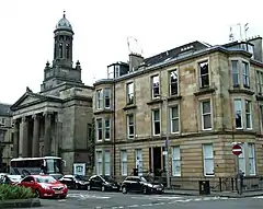 The nearby Queens's Rooms building at La Belle Place[18] also served as a Christian Science Church from the 1940s[19] before becoming a Hindu temple in 2006,[20][21][22] the largest such facility in Scotland. The building was designed in the 1850s by Charles Wilson who was also responsible for two adjacent blonde sandstone tenements featuring ornate carvings dating from the same time.[23]