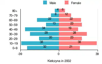 According to the 2002 Poland census, there were 392 people residing in Kiełczyna village, of whom 51% were male and 49% were female. In the village, the population was spread out, with 28.6% under the age of 18, 37.5% from 18 to 44, 17.3% from 45 to 64, and 16.6% who were 65 years of age or older.[1]