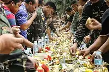 A boodle fight is a meal that dispenses with cutlery and dishes.[23] Diners instead practice kamayan.[24] The food is placed on top of a long banana leaf-lined trestle table and in the true military practice, diners do not sit in chairs but instead stand shoulder to shoulder in a line on both sides of the table.
