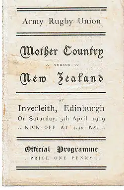 Llanelli's first official game after the War was against the New Zealand Army team from the Larkhill Garrison in Wiltshire. This was followed by games against the New Zealand Machine Gun Corps on 22 February 1919.[2] These and similar teams came together to make the New Zealand Army team. This team split into an 'A' and 'B' team when during a tour of Great Britain, an inter-services tournament, with a cup presented by King George V, was held between the allied forces.[3] The stronger New Zealand Army 'A' team took the challenge of the King's Cup and eventually triumphed over the British Army at Twickenham. The 'B' team continued the tour of Great Britain and France.