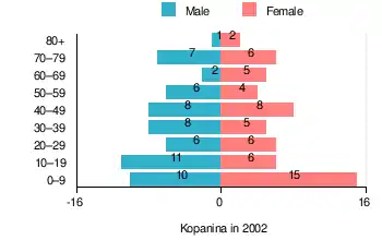 According to the 2002 Poland census, there were 116 people residing in Kopanina village, of whom 50.9% were male and 49.1% were female. In the village, the population was spread out, with 32.8% under the age of 18, 34.5% from 18 to 44, 13.8% from 45 to 64, and 19% who were 65 years of age or older.[1]