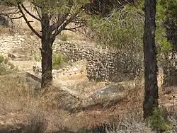 Archaeological work on a section of wall has revealed 60 m (200 ft) of defensive fortifications. The wall, built from medium-sized stones of soft sandstone and calcarenite limestone, was between 4 and 5 m (13–16 ft), and may have been over 7 metres (23 ft) wide at its base. An advanced architectural method was employed to construct it, with buttresses hígher than the brick being placed at regular points to isolate sections of the wall and prevent movement, such as that caused by an earthquake, from being transmitted along its entire length and making it unstable. Among the material culture found at La Fonteta is a large repertoire of Phoenician typological pottery: amphorae, plates, decorated cups, and a variety of red slipware and burnished pottery including rimmed plates, bowls, oenochoes, lamps, and tripods. Archaic Greek pottery, and ritual objects such as decorated ostrich eggs, ivory,[1] and scarabs, etc., appear as well.[2]
