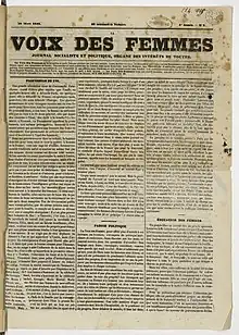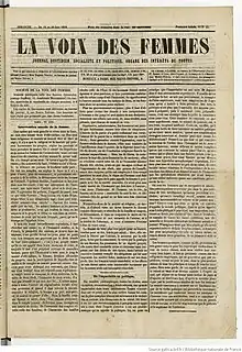 La Voix des Femmes (English: The Women's Voice) was a French socialist feminist newspaper, founded by Eugénie Niboyet in 1848. It was the first female-led paper to be published daily in France, and grew to encompass an entire organization known as the Société de la Voix des Femmes.[1] Some of its members included Jeanne Deroin, Suzanne Voilquin, Desirée Gay, and Amélie Pray.[2]