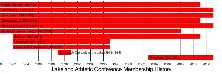 The Lakeland Athletic Conference was a high school athletic conference created in 1980 and disbanded in 2014. Founding members were Buchanan Bucks, Berrien Springs Shamrocks, Brandywine Bobcats, Cassopolis Rangers, Edwardsburg Eddies, and River Valley Mustangs. Later, Dowagiac, Lakeshore, Lake Michigan Catholic were added before they all later departed.
