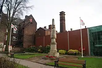 In the aftermath of the First World War and its unprecedented casualties, thousands of war memorials were built across Britain. Amongst the most prominent designers of memorials was the architect Sir Edwin Lutyens, described by Historic England as "the leading English architect of his generation".[1] Lutyens established his reputation designing country houses for wealthy clients. After the war, which had a profound effect on him, he devoted much of his time to memorialising its casualties. He became a public figure through his design for The Cenotaph on Whitehall in London, which became Britain's national memorial. This, along with his work for the Imperial War Graves Commission, led to commissions for war memorials across Britain and the empire. As well as memorials for towns and cities, Lutyens was commissioned to design memorials for several private companies and regimental associations, including the Lancashire Fusiliers. These tended to be the least controversial of Lutyens' war memorials—a site was readily available (in this case the regiment's home barracks) and fundraising was straightforward.[1][2]