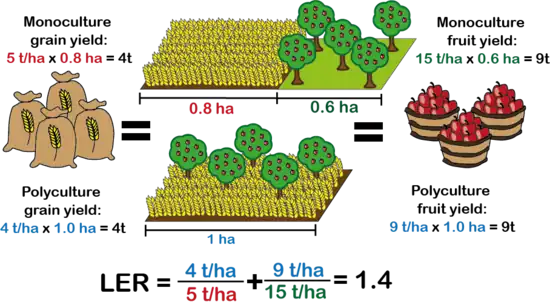 The land equivalent ratio can be used whenever more than one type of yield can be obtained from the same area. This can be intercropping of annual crops (e.g. sorghum and pigeonpea)[1] or combination of annual and perennial crops e.g. in agroforestry systems (e.g. jackfruit and eggplant).[3]