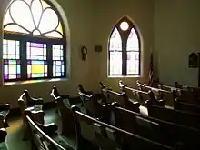 The windows in the church are antiques and were imported from England. An earlier church building, constructed during the 1780s, had a beeswax coating on the windows.[8]